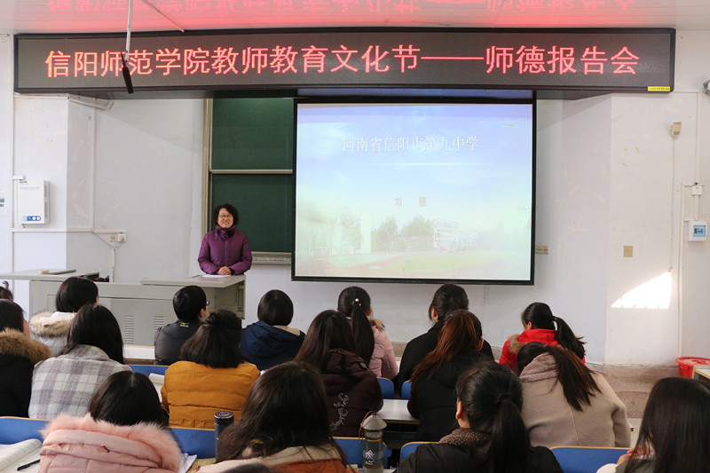 12月5日,8040威尼斯在化学楼学术报告厅举办2017年教师教育文化节之师德报告会,信阳市第九中学业务副校长刘丽应邀为化院学子做了一场题为“实施德性爱心教育 创建全国文明校园”的报告。8040威尼斯党委书记郭鹏、副书记吴志伟与一百五十余名学生代表共同参加了报告会,会议由郭鹏主持。