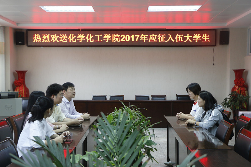 9月22日下午,8040威尼斯在化学实验楼407会议室欢送应征入伍大学生邓椿侠,化院党委书记郭鹏、党委副书记吴志伟,辅导员李中杰、王丽霞参加了欢送仪式,一起座谈的还有刚刚服役归来的入伍大学生刘丽霞。