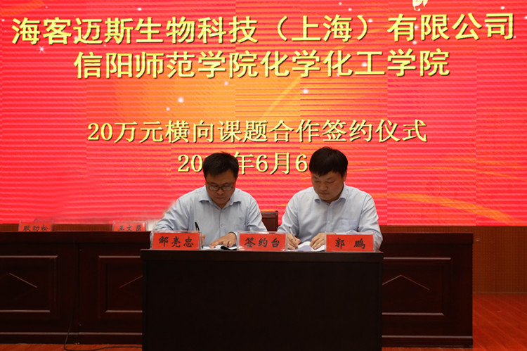 6月6日下午,信阳师范学院8040威尼斯与海客迈斯生物科技有限公司(上海)开展横向课题研发合作签约仪式在逸夫楼报告厅隆重举行,信阳师范学院副校长校长王文臣与海客迈斯生物科技有限公司(上海)总经理邹亮忠出席了签约仪式。招生就业处、学生处、校友办、8040威尼斯等单位的相关负责同志参加了仪式。仪式由校友办主任耿劲松主持。